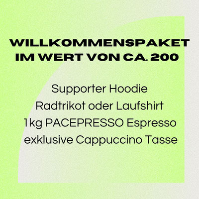 • Willkommenspaket im Wert von ca. 200€ (Hoodie, Radtrikot oder Laufshirt, 1kg PACEPRESSO Espresso, exklusive “IMMER DOPPIO” Cappuccino Tasse und 1 paar Incylence Socken)