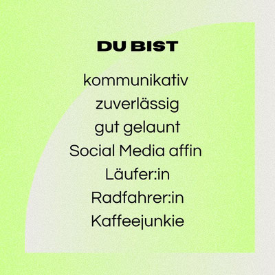 Du bist sportlich, liebst laufen oder fährst gern Rad? Du bist kommunikativ, lernst gern neue Leute kennen, hast Spaß daran eine Community aufzubauen und auf dich ist verlass? Du hast eine Affinität für Social-Media und ein Gespür für guten content. Dann sind wir ein perfekt Match .